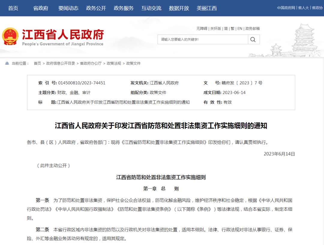 江西省人民政府關于印發江西省防范和處置非法集資工作實施細則的通知