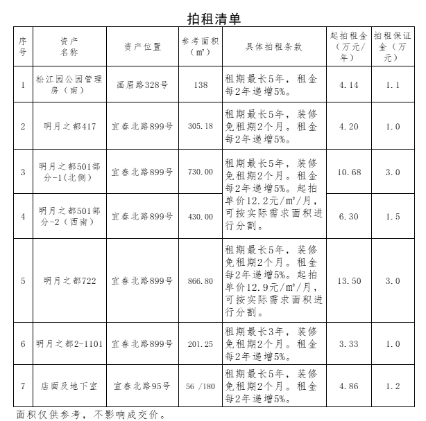 畫(huà)眉路328號(hào)松江園公園管理房(南),宜春北路899號(hào)明月之都部分資產(chǎn),宜春北路95號(hào)原軍轉(zhuǎn)大廈樓下2間店面及地下室。