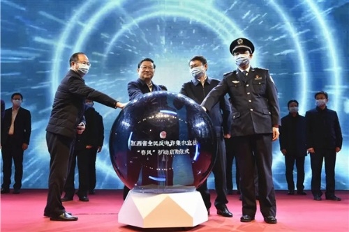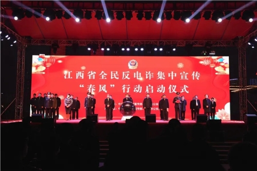 2月9日晚20時,省委宣傳部、省公安廳在南昌市秋水廣場舉行江西省全民反電詐集中宣傳“春風”行動啟動儀式。副省長、公安廳長秦義出席儀式并下達啟動命令,儀式由省政府副秘書長吳龍強主持,公安部督導組成員、省委宣傳部副部長吳永明,南昌市委副書記、市政府黨組書記萬廣明出席儀式。省公安廳黨委委員、南昌市副市長、市公安局長萬秀奇,省公安廳黨委委員、副廳長、廳際聯席會議召集人胡滿松出席儀式并講話。江西省打擊治理電信網絡新型違法犯罪成員單位的負責同志、省公安廳在昌廳領導、廳直各單位主要負責人,南昌市委宣傳部、市委政法委、市檢、法主要負責人,中央和省市各大新聞媒體記者、南昌市干部群眾代表共400余人參加儀式。全省市縣兩級黨委宣傳部門、公安機關設立110個分會場,同步舉行“春風”行動啟動儀式。