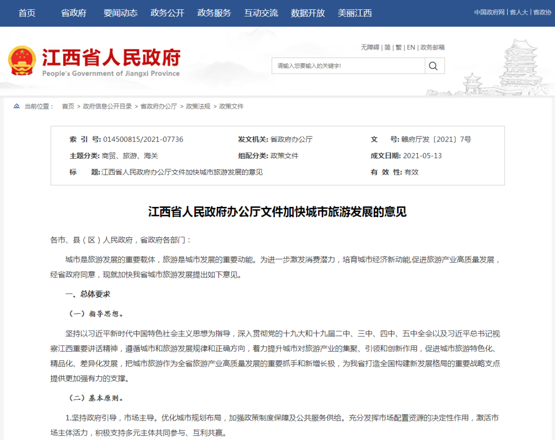 江西省人民政府辦公廳關于加快城市旅游發展的意見