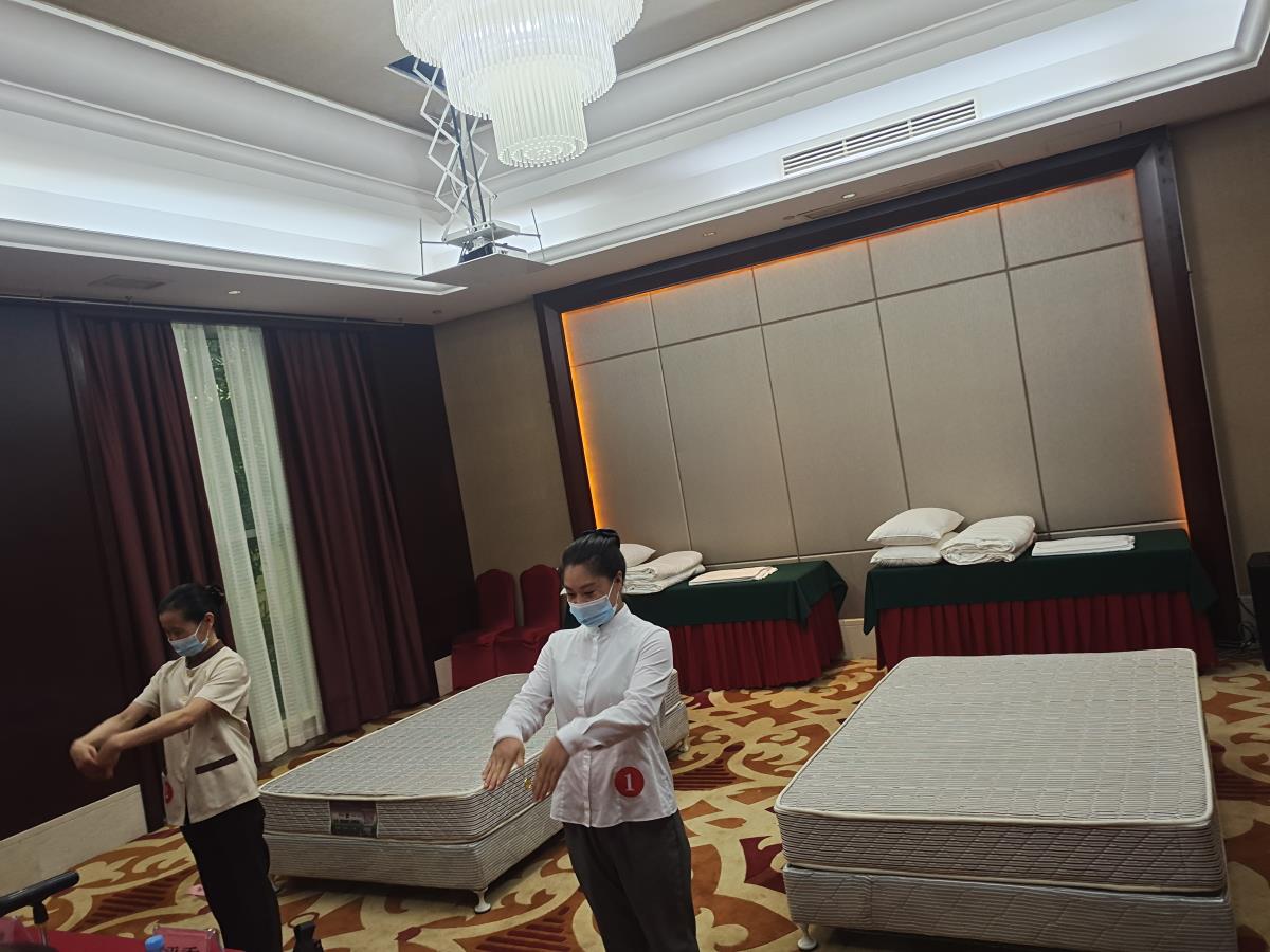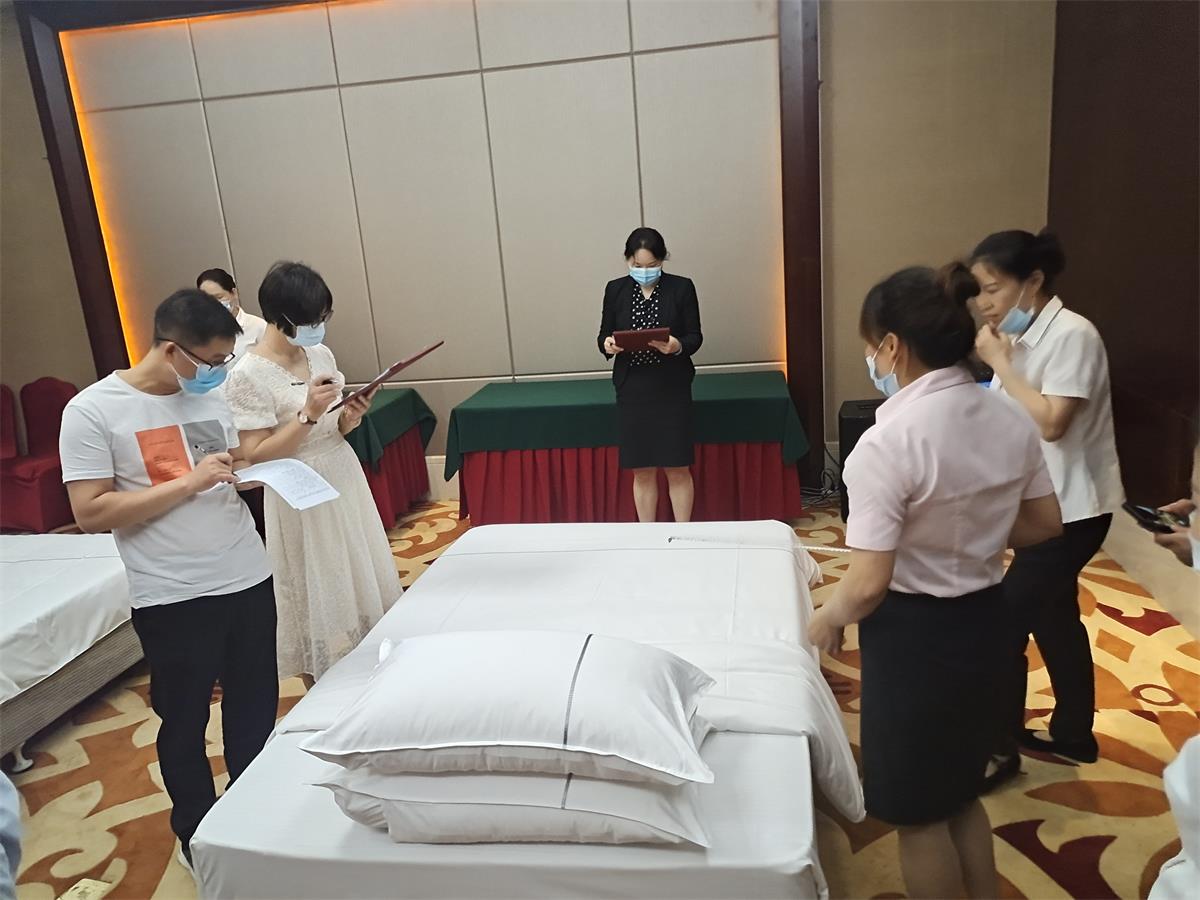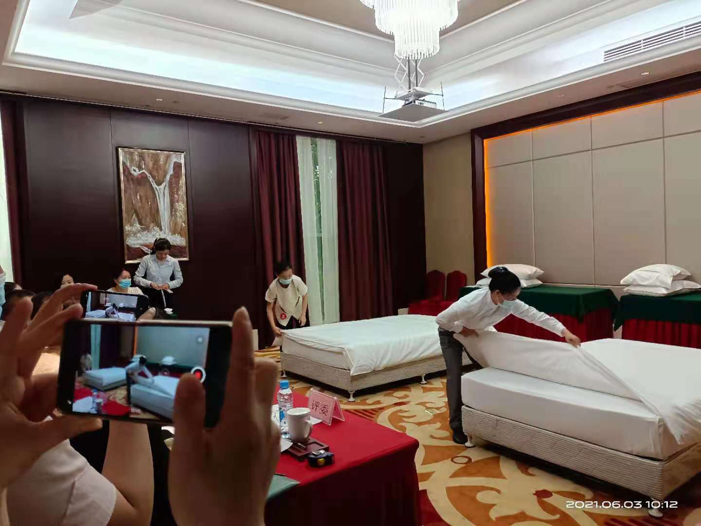 6月3日上午9:30,競賽在宜春迎賓館伯爾尼廳舉行,東湖酒店參賽選手信心滿滿、胸有成竹地投入技能競賽。主持人宣布了競賽規(guī)則和評分標(biāo)準(zhǔn),隨著比賽開始指令下達(dá)后,迅速進(jìn)入“比賽狀態(tài)”,動(dòng)作嫻熟敏捷、整齊規(guī)范,甩單定位、包角、裝被、套枕每一個(gè)程序仿若行云流水,一氣呵成,完美地展示了業(yè)務(wù)技能和職業(yè)素養(yǎng),讓人賞心悅目。