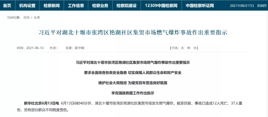 中共中央總書記、國家主席、中央軍委主席習近平立即作出重要指示,湖北十堰市燃氣爆炸事故造成重大人員傷亡,教訓深刻!要全力搶救傷員,做好傷亡人員親屬安撫等善后工作,盡快查明原因,嚴肅追究責任。習近平強調,近期全國多地發生生產安全事故、校園安全事件,各地區和有關部門要舉一反三、壓實責任,增強政治敏銳性,全面排查各類安全隱患,防范重大突發事件發生,切實保障人民群眾生命和財產安全,維護社會大局穩定,為建黨百年營造良好氛圍。