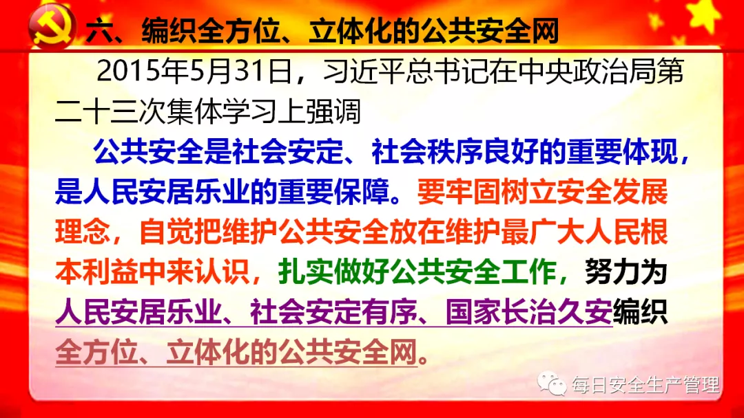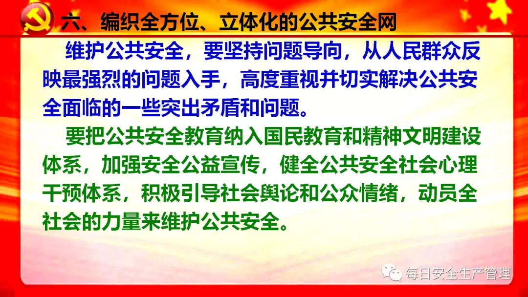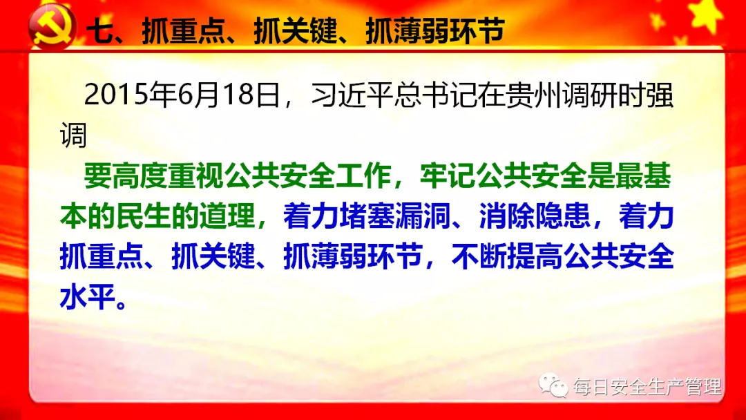 6、增強政治敏銳性,全面排查各類安全隱患,防范重大突發事件發生,切實保障人民群眾生命和財產安全,維護社會大局穩定,為建黨百年營造良好氛圍。