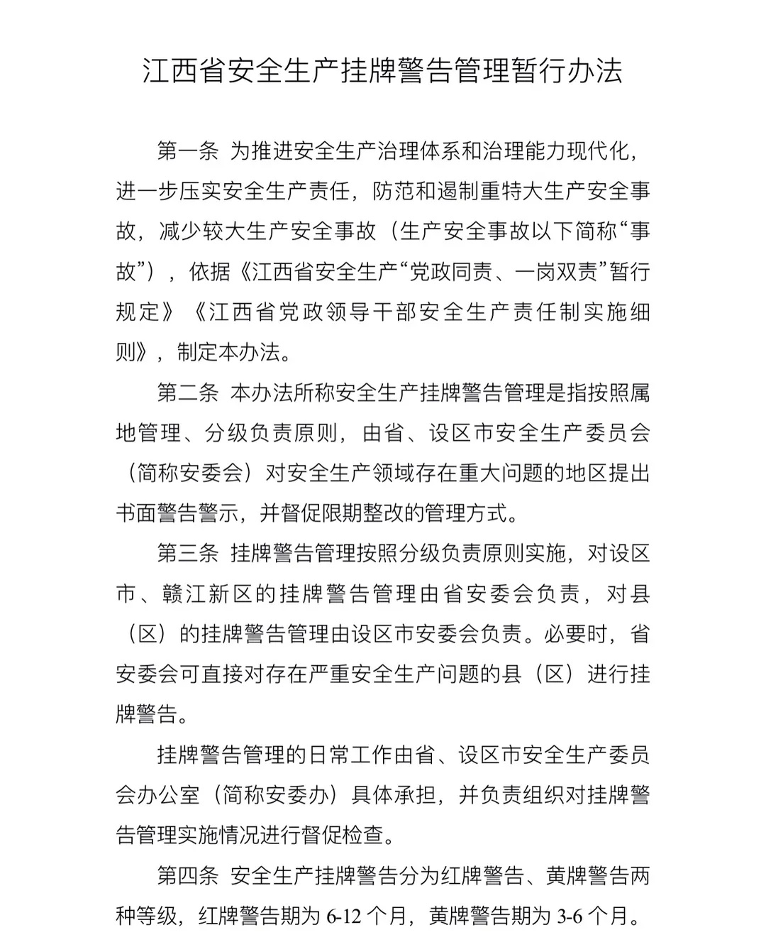 重磅!省安委會印發《江西省安全生產掛牌警告管理暫行辦法》