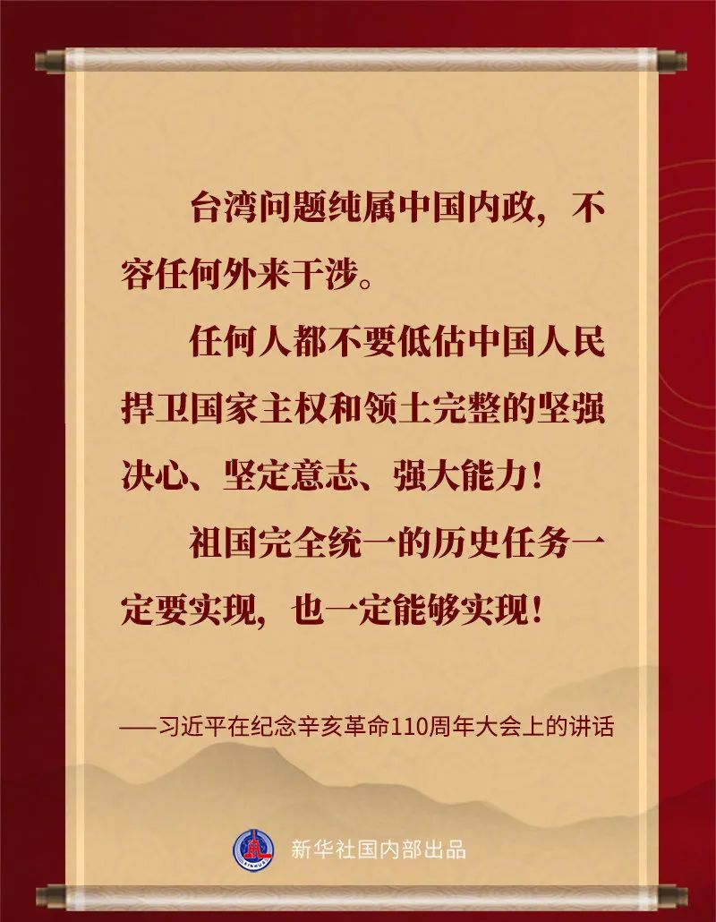 習近平說,中華民族具有反對分裂、維護統一的光榮傳統。“臺獨”分裂是祖國統一的最大障礙,是民族復興的嚴重隱患。凡是數典忘祖、背叛祖國、分裂國家的人,從來沒有好下場,必將遭到人民的唾棄和歷史的審判!臺灣問題純屬中國內政,不容任何外來干涉。任何人都不要低估中國人民捍衛國家主權和領土完整的堅強決心、堅定意志、強大能力!祖國完全統一的歷史任務一定要實現,也一定能夠實現!