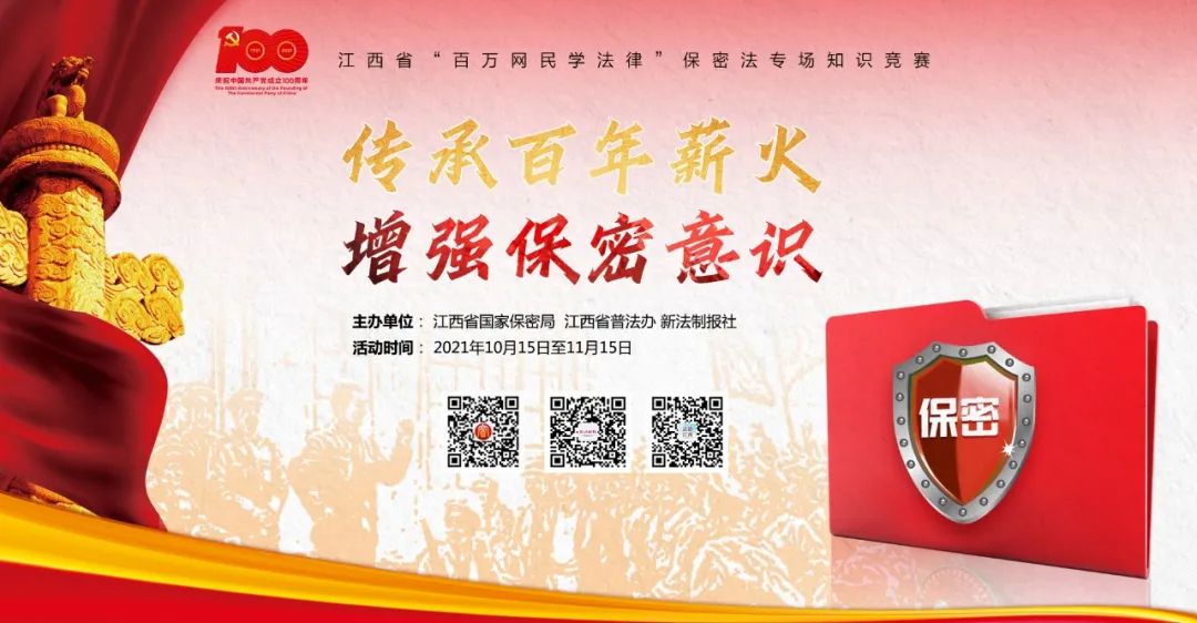 江西省保密局聯合江西省普法辦、新法制報社,將在全省開展2021年江西省“百萬網民學法律”保密法專場知識競賽活動。