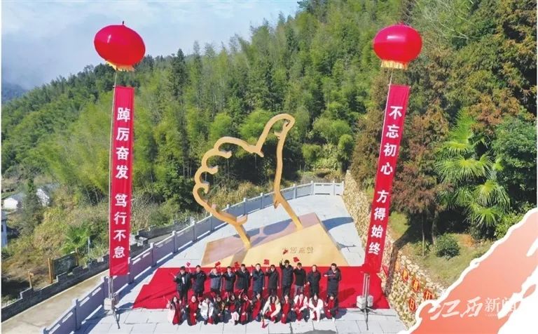 ▲1月26日,井岡山市茅坪鎮干部在“為您點贊”雕塑前祝福黨和祖國。 攝影 | 江西日報記者 李 劼