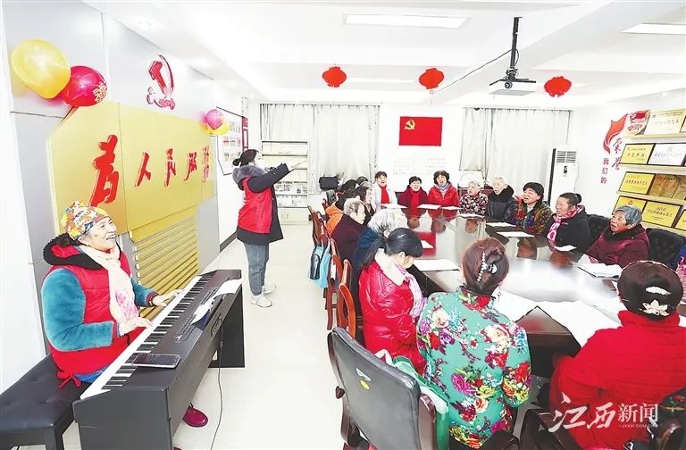 ▲1月28日,南昌市東湖區光明社區鄰里中心,老人們聚在一起排練合唱歌曲。攝影 | 江西日報記者 吳文兵