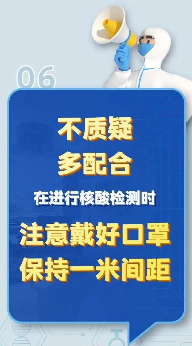 5.核酸采樣時(shí)不要再喊“啊”。喊“啊”時(shí)可能會(huì)呼出大量病毒,并在采樣區(qū)域形成氣溶膠,造成采樣點(diǎn)環(huán)境直接污染,等下一位檢測時(shí),可能無法避免地將帶病毒的氣溶膠吸入呼吸道。