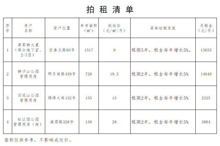本公司委托宜春江南拍賣有限公司,于2022年6月28日上午10時在宜春市景福陽光大酒店6樓會議室舉行拍租會,拍租標的:1、位于宜春市松江園公園(南)的管理用房;2、位于百花山公園的管理用房;3、位于獅子山公園的管理用房;4、原軍轉大廈(部分地下室、2-7層)。以上標的詳情見拍租清單。