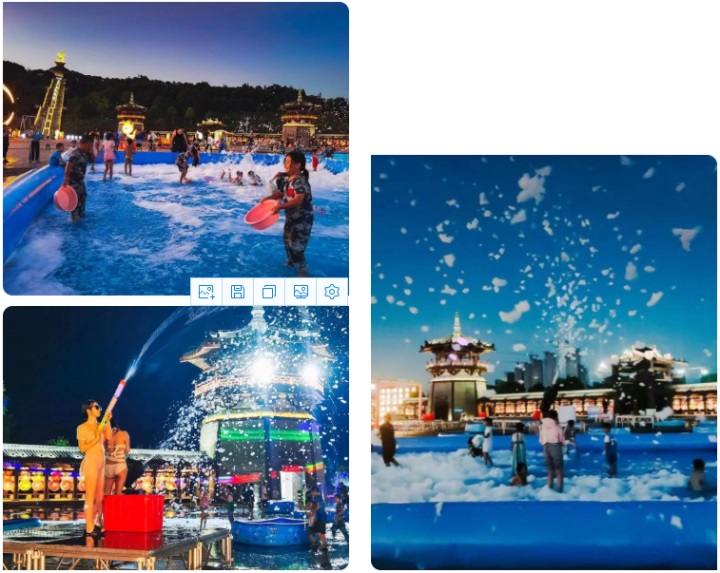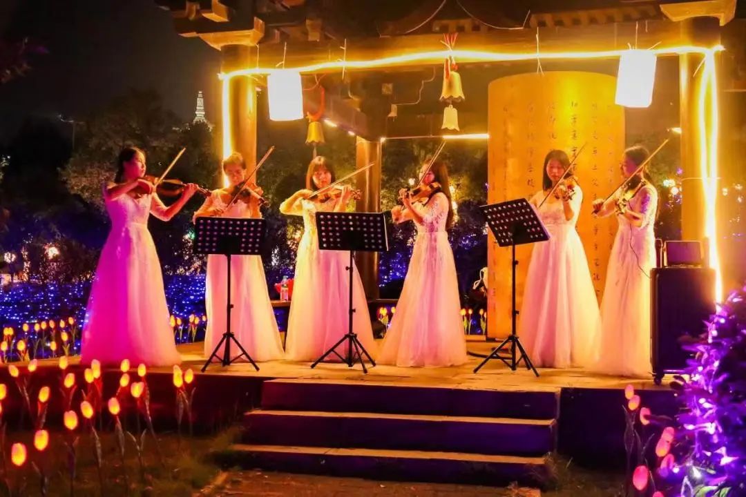 夜幕降臨,華燈初上,微風拂面,落日余暉映照下的禪博園分外美麗。來自省內外的游客、以及宜春四面八方的市民蜂擁而至,萬眾期待的夜游燈光秀華麗上演,數十萬盞LED燈以各種造型被同時點亮,星星點點的燈光將整個園區點綴得猶如璀璨的銀河一般奪目,通過將藝術燈光、全息投影等新技術有機結合,空間視錯覺與光影特效完美融合,游客身臨其境,沉浸漫步在宇宙太空之中。景區內除了燈光秀,更有夏沫潑水節、套圈、撈魚等兒童喜愛的游戲攤位也是五花八門,應有盡有,孩子們在家人的陪伴下玩得不亦樂乎,享受著夜晚難得的親子時光。