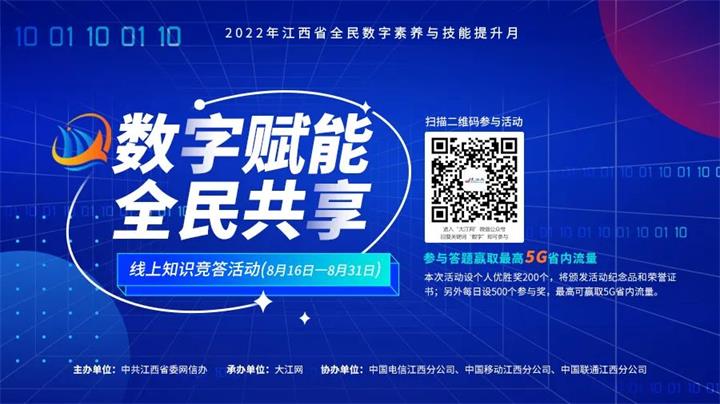 為加快實施全民數字素養與技能提升行動,普及數字素養與技能相關知識,提升全民數字化適應力、勝任力、創造力,營造全社會廣泛關注并積極參與的濃厚氛圍,在2022年江西省全民數字素養與技能提升月期間,中共江西省委網信辦牽頭舉辦的“數字賦能 全民共享”主題線上知識競答活動正式啟動。