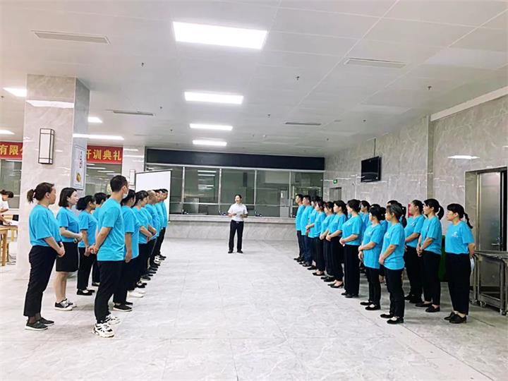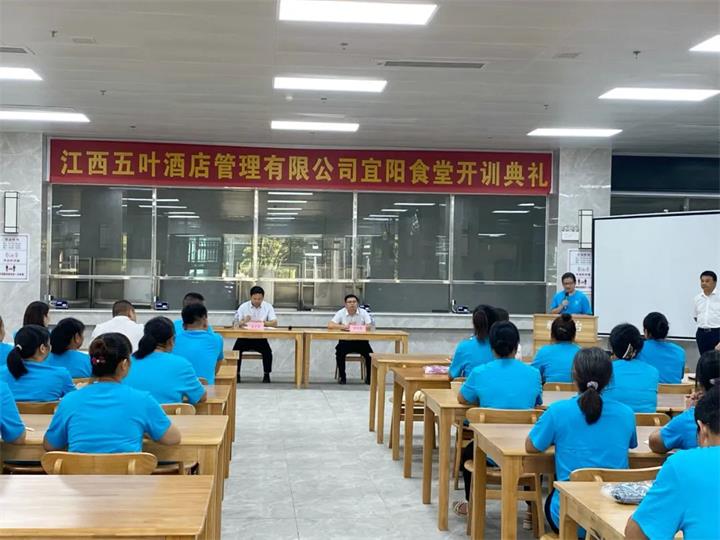 宜春旅游集團轄屬江西五葉酒店管理有限公司宜陽食堂開業在即,為規范從業人員服務操作,提高項目管理水平,增強安全防范意識,根據籌備組工作部署,8月26日上午,開訓典禮活動在宜陽東食堂如期舉行,受宜春旅游集團黨委委員、董事、副總經理陽磊委托,宜陽食堂籌備組左建群主持開訓典禮,食堂籌備組成員、勞務外包單位負責人以及招聘人員共計50余人參加了典禮儀式。