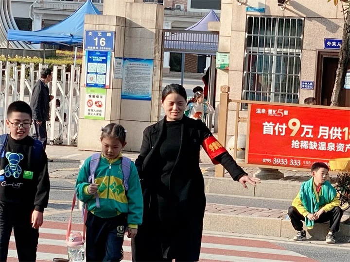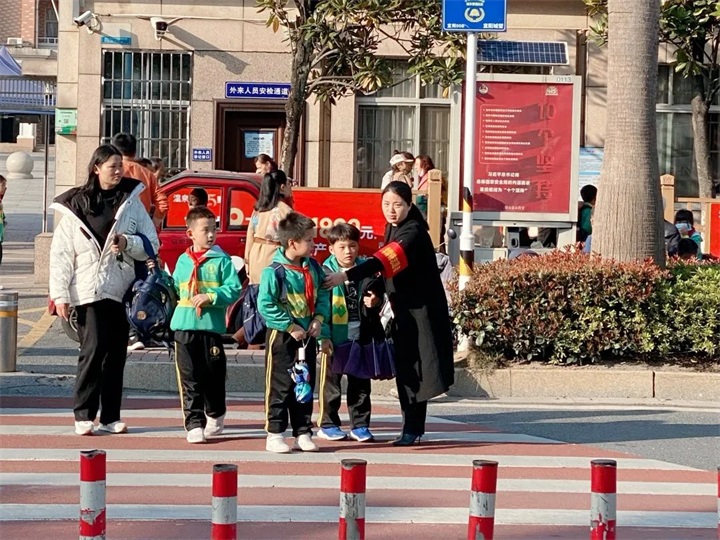 在宜陽學校大門前,宜陽食堂的志愿者結合周邊地區實際情況,組織開展交通志愿服務活動。在學校放學高峰時段,志愿者引導車輛讓行,組織學生遵守交通規則、有序通過人行橫道,為孩子們安全回家“保駕護航”。